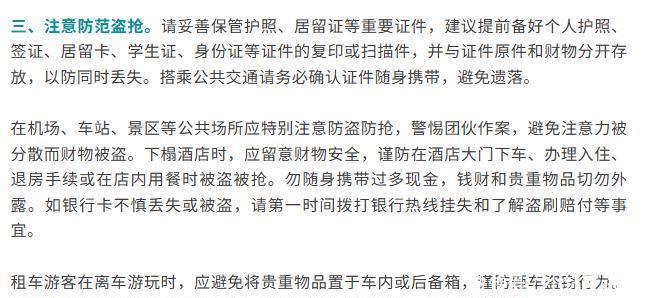 其中,第三点提到“注意防范盗抢”:请妥善保管护照、居留证等重要证件,建议提前备好个人护照、签证、居留卡、学生证、身份证等证件的复印或扫描件,并与证件原件和财物分开存放,以防同时丢失。搭乘公共交通请务必确认证件随身携带,避免遗落。在机场、车站、景区等公共场所应特别注意防盗防抢,警惕团伙作案,避免注意力被分散而财物被盗。下榻酒店时,应留意财物安全,谨防在酒店大门下车、办理入住、退房手续或在店内用餐时被盗被抢。勿随身携带过多现金,钱财和贵重物品切勿外露。如银行卡不慎丢失或被盗,请第一时间拨打银行热线挂失和了解盗刷赔付等事宜。租车游客在离车游玩时,应避免将贵重物品置于车内或后备箱,谨防砸车盗窃行为。如遇盗抢等突发事件应及时报警,并注意收集线索信息、保存相关凭证。中国驻荷兰王国大使馆官方账号点亮和让更多小伙伴知道这个消息↓↓↓江阴时刻 ,赞 500