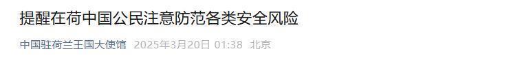 今年3月,中国驻荷兰王国大使馆官方账号曾发文“提醒在荷中国公民注意防范各类安全风险”。