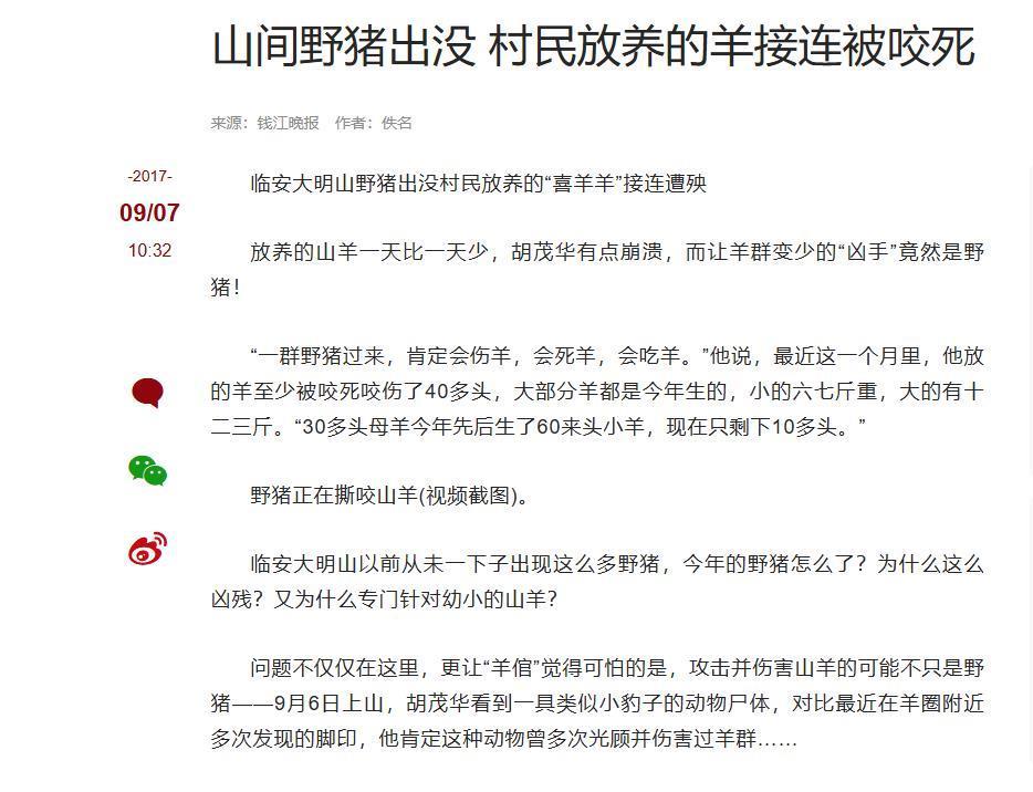 记者注意到,2017年曾有公开报道显示,浙江临安大明山有野猪出没,一个月时间里,有村民家放的羊至少被咬死咬伤了40多头,大部分都是当年生的羊,小的六七斤重,大的有十二三斤。
